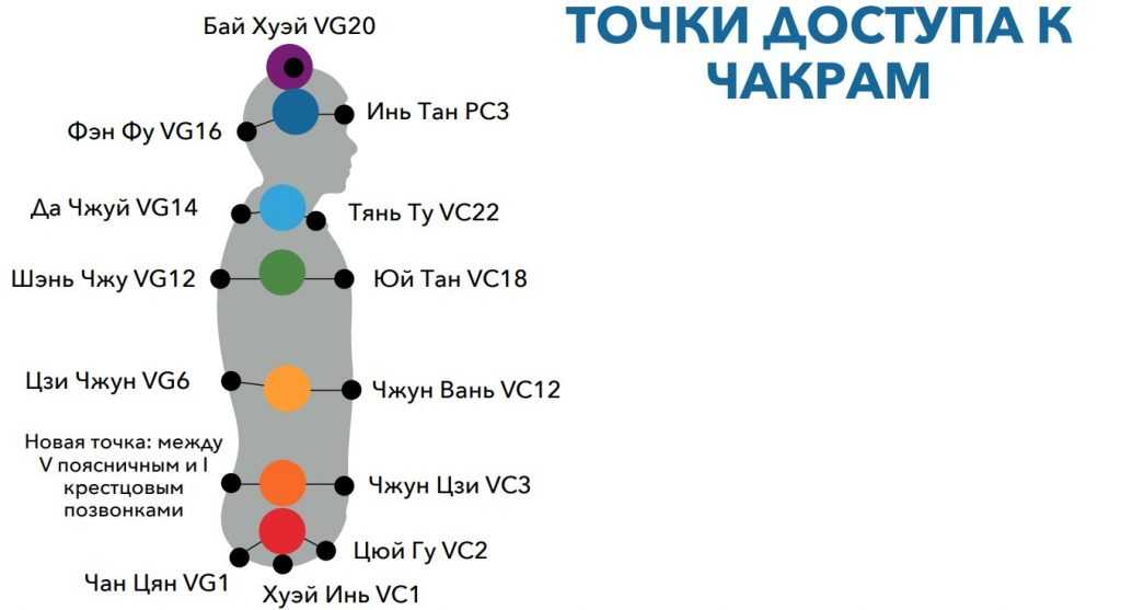 Каждой чакре соответствует 2 – 3 точки на поверхности тела, которые известны как акупунктурные. Воздействуя на них можно влиять на состояние чакры и энергетики.