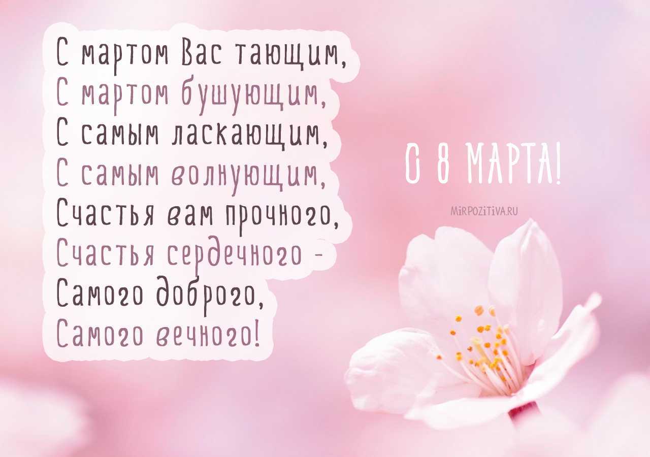 …Впрочем, не важно, кому вы выбираете красивые поздравления с 8 марта: бабушке, девушке, сотрудницам-коллегам, педагогу или подружке детства. Главное, чтобы эти слова шли от самой души!