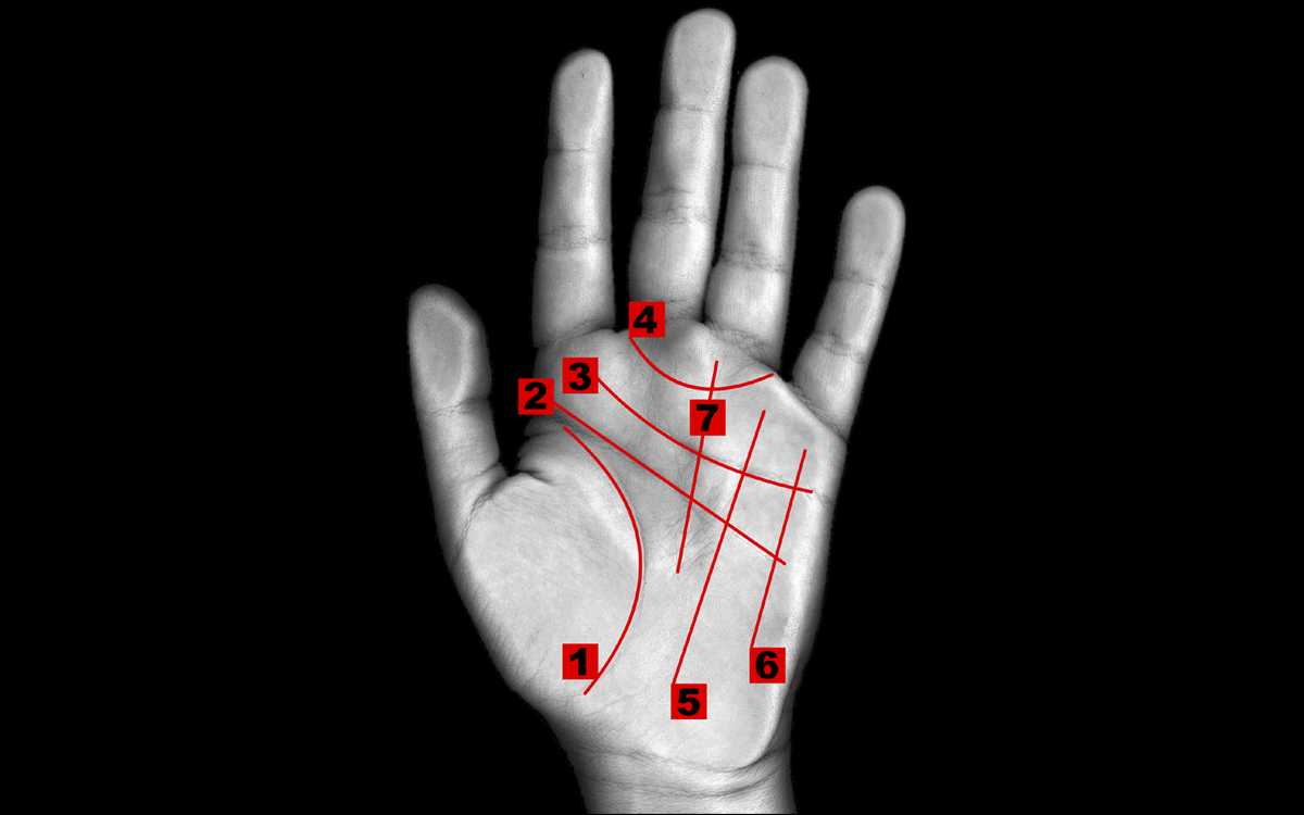 1) линия жизни, 2) линия головы, 3) линия сердца, 4) кольцо Венеры, 5) линия Солнца, 6) линия Меркурия, 7) линия судьбы