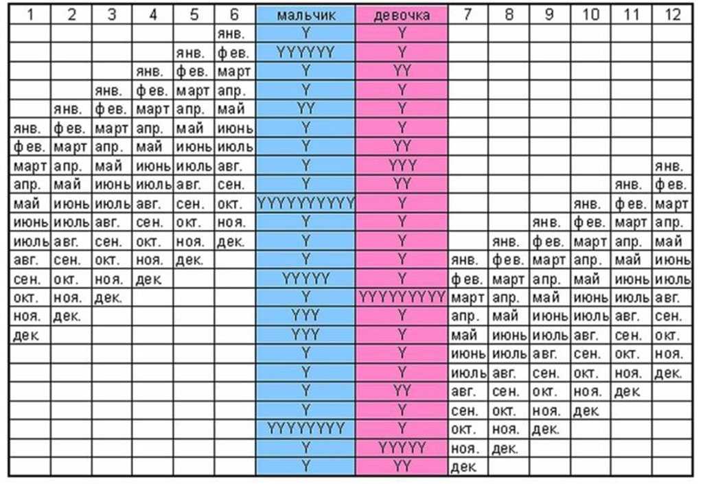 В таблице №2 в верхнем ряду найдите свое число совместимости. В этом столбце будут указаны месяца для данной конкретной пары. Степень вероятности зачатия ребенка мужского или женского пола показана в центральных цветных столбцах. Если больше Y – в результате зачатия должен рождаться мальчик, если Х – девочка.