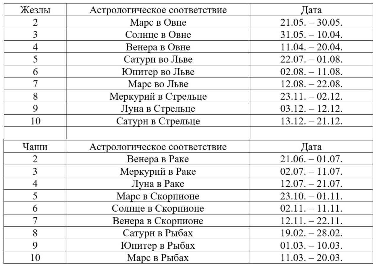 Знаки Зодиака в Таро равной степени соответствуют числовым и придворным картам с 4 мастей – младшим арканам, это видно по таблице совместимости (1–3 декады знака):