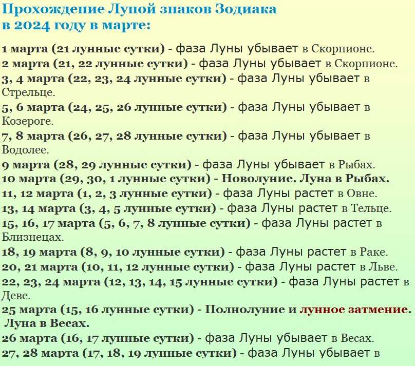 Даты прохождения Луной зодиакального круга в марте 2024 года.