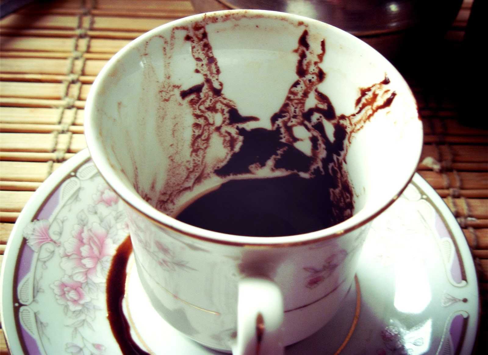 - Выпить горячий кофе, оставив немного жидкости на дне фарфоровой чашки.