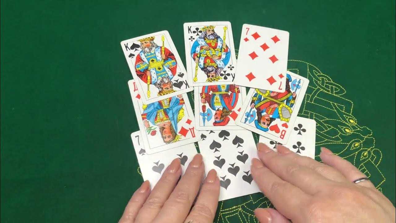 Те же карты, которые остались, не следует перемешивать, а разложить по две в правом углу — сверху и снизу от своей карты, открывая масть.