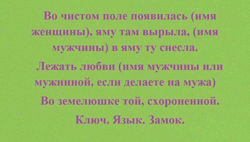 «Взяла я водицы чистой и ключевой, кладу я в нее травы жгучие, шипучие, корни дурманные, ко мне приманные, пьянящие до сладости. Варю я сей варю, боготворю и силой наделяю, да крылом ангела накрываю. Слова моего не разрушить, не изменить, не переворотить. Ключом каменным свое слово закрываю, и в сырой земле его скрываю. Наговора моего не снять так же, как матушки-земли дна не достать.»