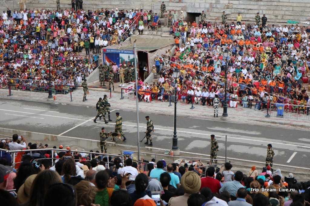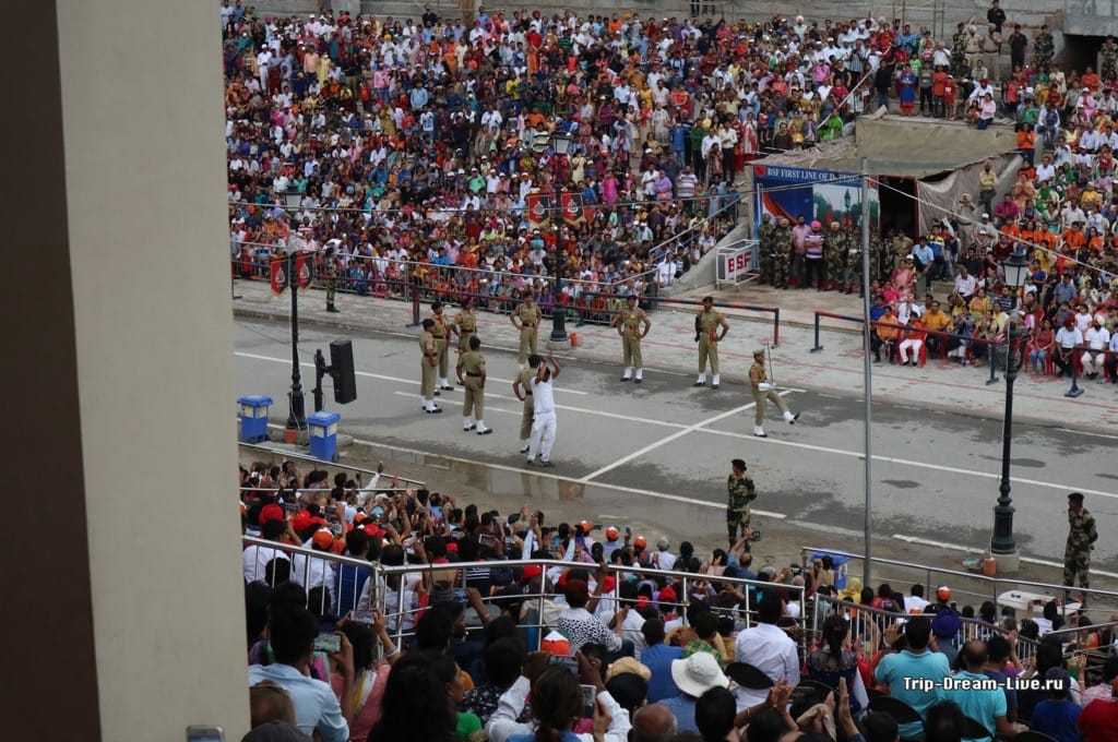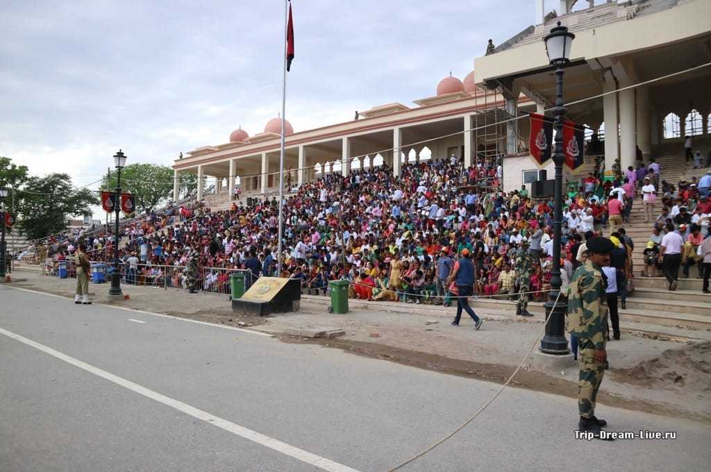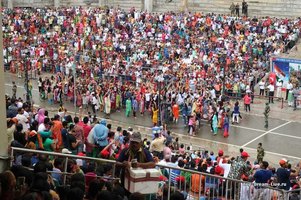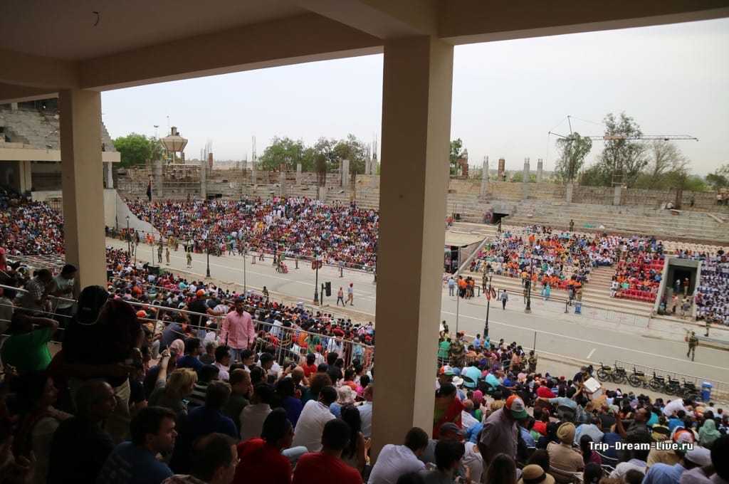 Тысячи людей, как туристов, так и индийцев, стекаются на трибуны, чтобы посмотреть дружеское соревнование между Индией и Пакистаном.