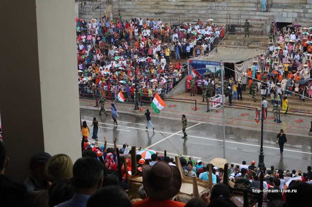 Люди вокруг нас машут флагами и кричат «Да здравствует Индия» вместе со многими другими песнопениями и приветствиями. Они делают паузу достаточно долго, чтобы мы услышали крики Пак-и-Стана с другой стороны, что вызвало еще больший шум.