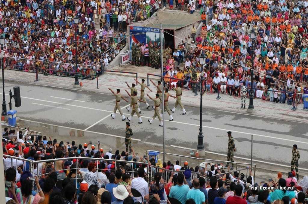Как только солнце начинает садиться, музыка выключается и начинается церемония. Ведущий ведет толпу через приветствия, поскольку индийские пограничники начинают свои марши. Это не ваши обычные марши на каждый день.
