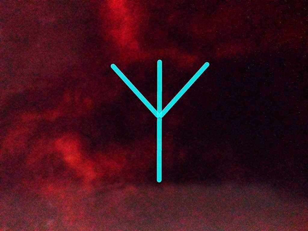 Для изображения Альгиз вам нужно будет сначала провести вертикаль. Затем еще две наклонные короткие черты, расположенные зеркально. Они должны пересечь вертикаль в точке, чуть выше середины.