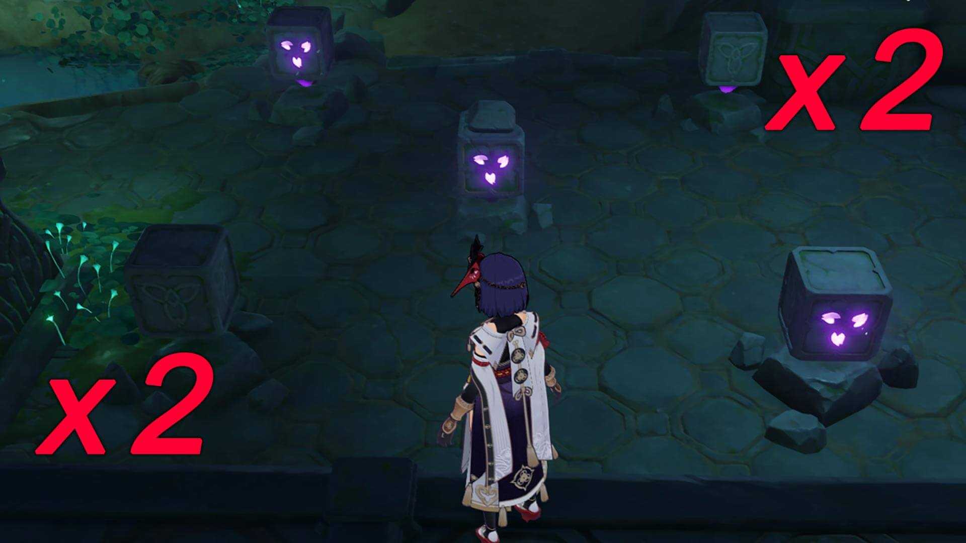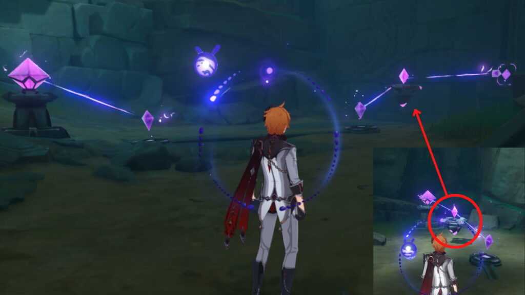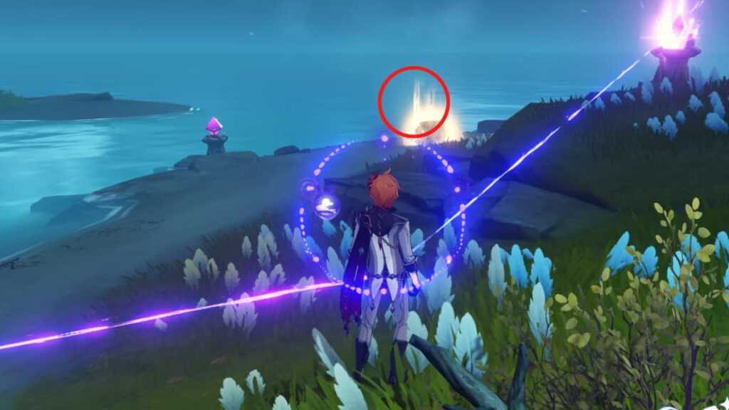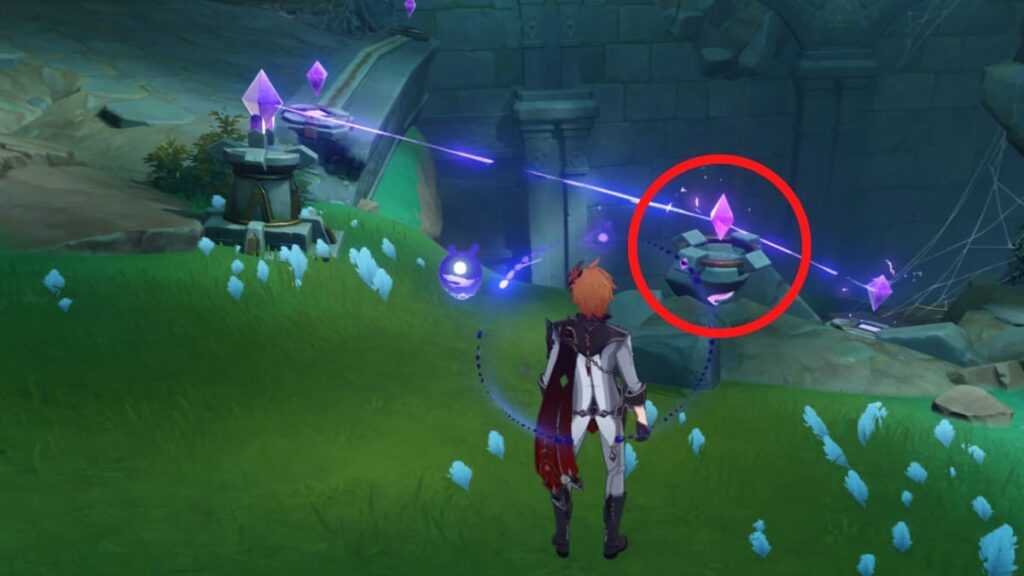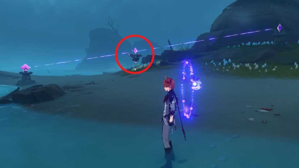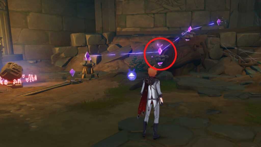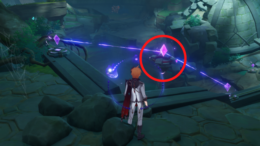 Вторая часть немного сложна, поэтому вам, возможно, придется попробовать несколько раз, чтобы понять это правильно. Вы найдете Electro Seelie поблизости. Вместо того, чтобы лететь к сундуку, он будет следовать за вами и помогать вам создавать электрические токи. Принесите своего персонажа к месту у травы на изображении выше, и Благие полетят в область, отмеченную красным. Это позволит всем камням соединиться, завершив головоломку.