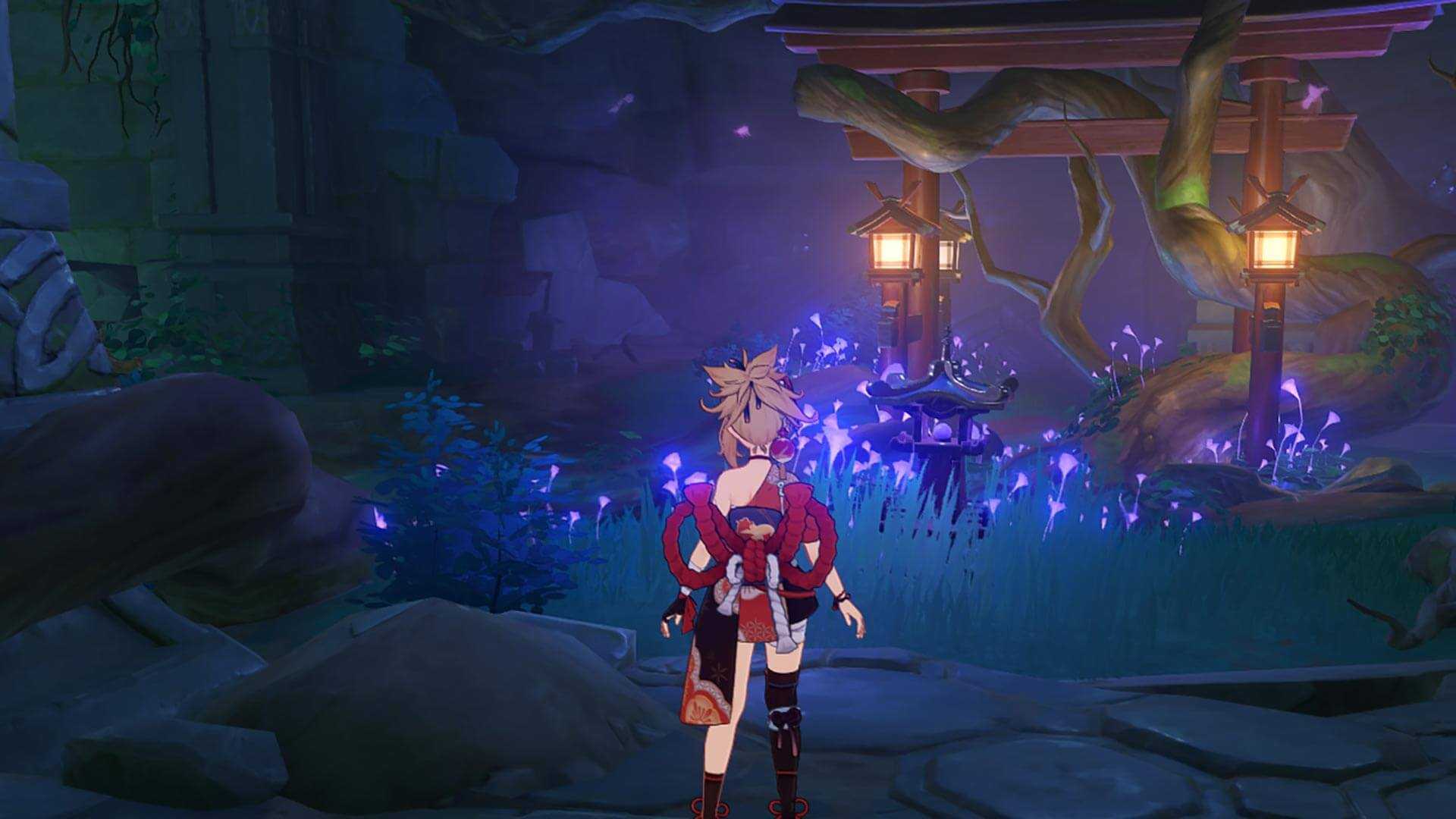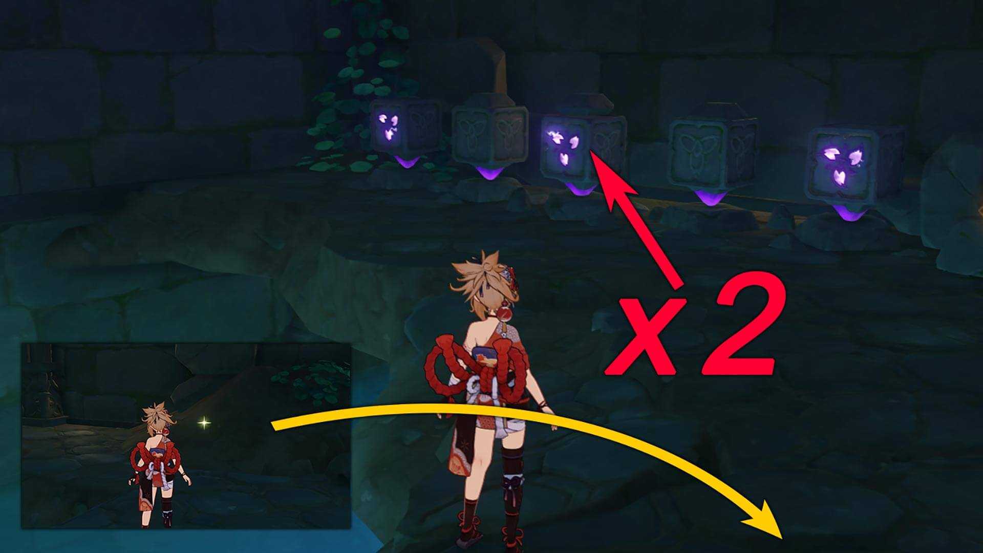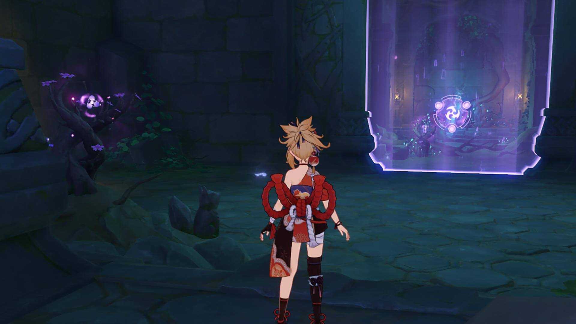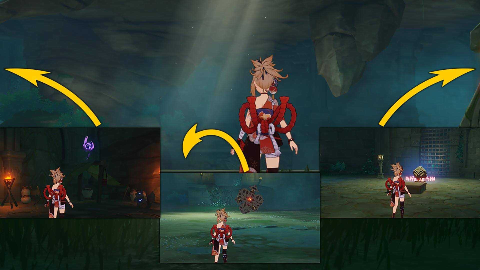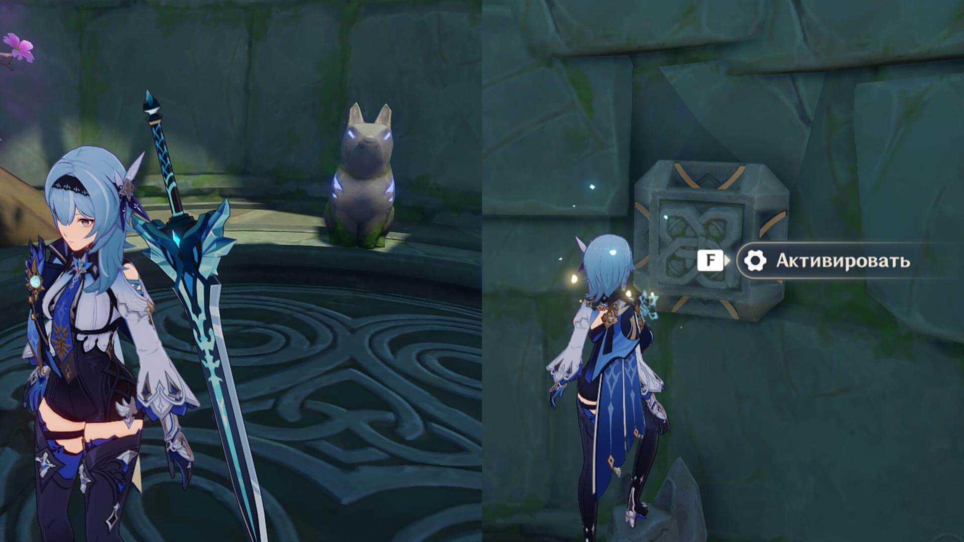 Спуститесь под пик Сирикоро и бегите в пещеры, через комнату с полуразрушенным куполом. Сразу за ней справа будет нужное изваяние. Активируйте его и на стене появятся призрачные факелы. Их нужно зажечь пиро персонажем (подойдет Эмбер).