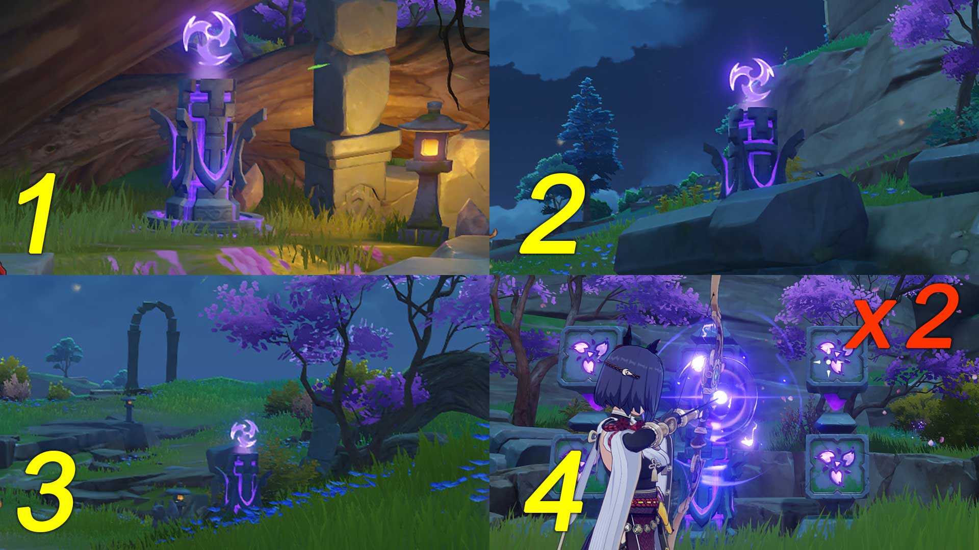 После активации механизма внутри башни открывается второй уровень, где есть ветка сакуры с Электрогранумом и три статуи кицунэ. Используйте линзу памяти на статуях кицунэ, и на стене появятся три нажимные пластины.