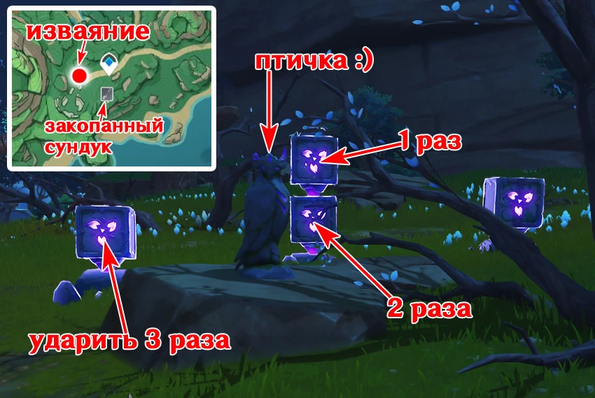 Возьмите ее и снова следуйте за феей, которая приведет вас назад к статуе птицы. Поместите табличку в место, показанное на скриншоте ниже. Затем следуйте за вторым духом. Поднимите очередной артефакт и вернитесь назад, чтобы активировать постамент. Теперь бегите за третьей феей. Карабкайтесь за ней наверх по скале. Разберитесь с двумя хиличурлами и выкопайте нужный предмет. Их расположение показано на скриншотах ниже.