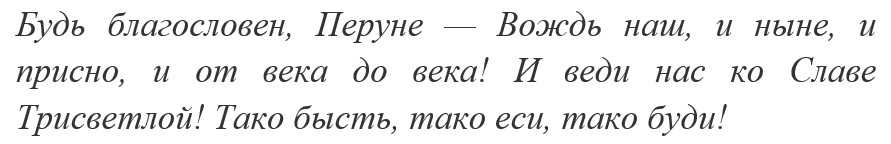 Перуне! Вми призывающим Тя, Славен и Триславен буди! Здравия и множество Рода всем чадам Сварожьим дажьди, Родам покровительства милость яви, прави над всеми, вще из-Родно! Тако бысть, тако еси, тако буди!