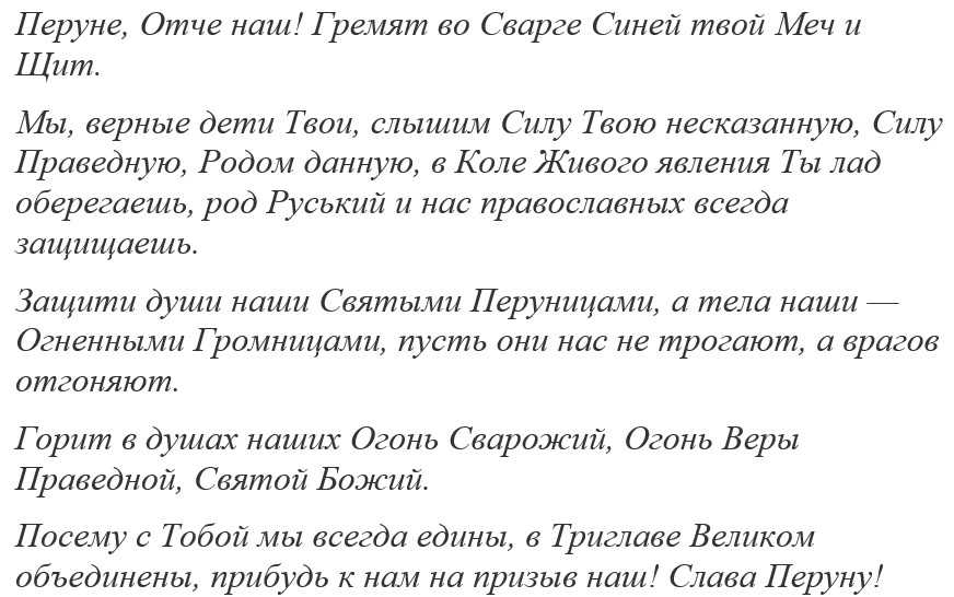 Перуне, Отче наш! Гремят во Сварге Синей твой Меч и Щит. Мы, верные дети Твои, слышим Силу Твою несказанную, Силу Праведную, Родом данную, в Коле Живого явления Ты лад оберегаешь, род Руський и нас православных всегда защищаешь. Защити души наши Святыми Перуницами, а тела наши — Огненными Громницами, пусть они нас не трогают, а врагов отгоняют. Горит в душах наших Огонь Сварожий, Огонь Веры Праведной, Святой Божий. Посему с Тобой мы всегда едины, в Триглаве Великом объединены, прибудь к нам на призыв наш! Слава Перуну!