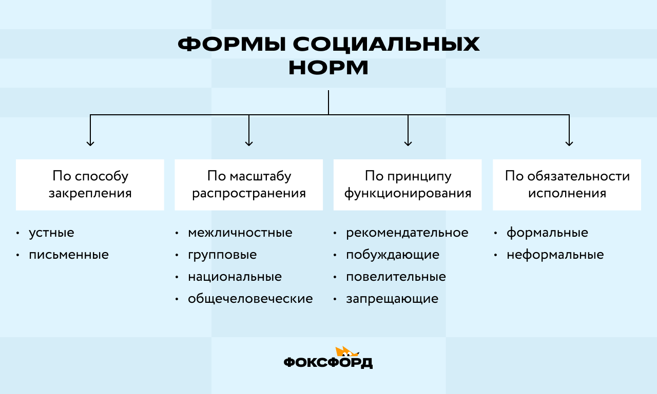 Кроме того, социальные нормы разделяются на формы в зависимости от принципа функционирования: