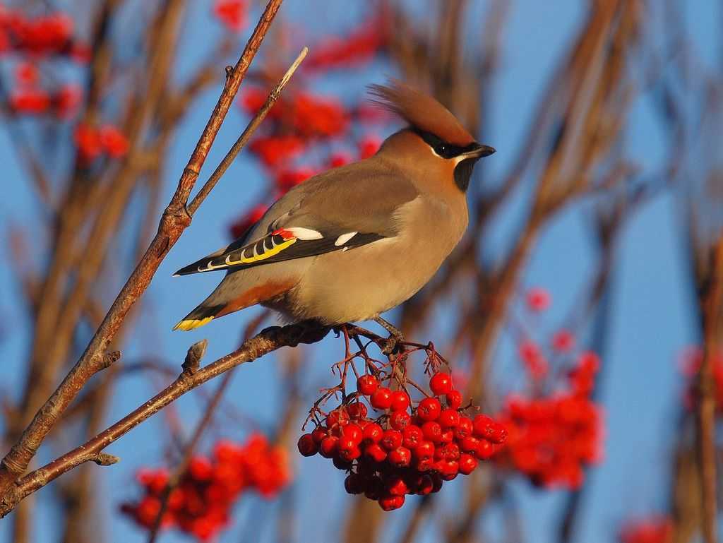 Эти птички летают преимущественно стаями, поэтому ничего удивительного в их больших скопищах нет. Однако, свиристель славится своей прожорливостью. Когда целая стая этих птиц опускается на лес или на загородный участок, можно не сомневаться – на нем не останется ни калины, ни рябины, ни барбариса с шиповником. Не поздоровится сохранившемуся на ветвях терну, как и любым другим ягодам. Свиристели объедают все под чистую не хуже полчища саранчи.