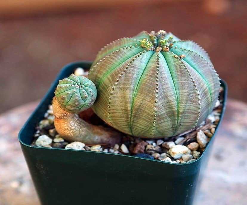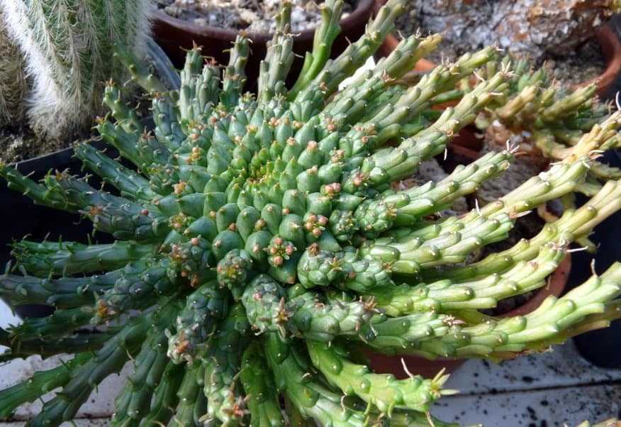 Молочай тучный — форма этого суккулента цилиндрическая, ребра бугристые, но выражены слабо. Этот сорт молочая обладает очень скромными размерами — при диаметре до 8 см высота не превышает 10 см.