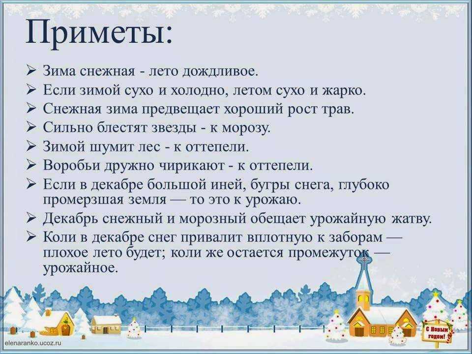 С помощью примет можно узнать о погоде на следующий сезон. К примеру, плотный снег в декабре предвещает дождливое лето. «Голая» же земля зимой означает сухую погоду в июне.
