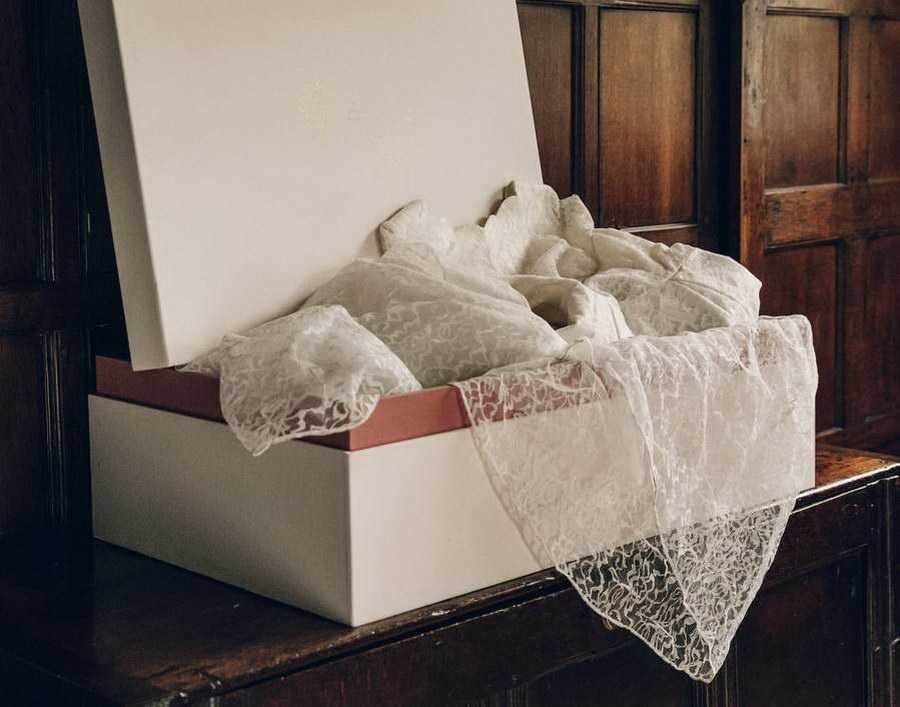 Лучше всего хранить свадебное платье в коробке, при этом коробка должна пропускать воздух во избежание образования плесени и грибков