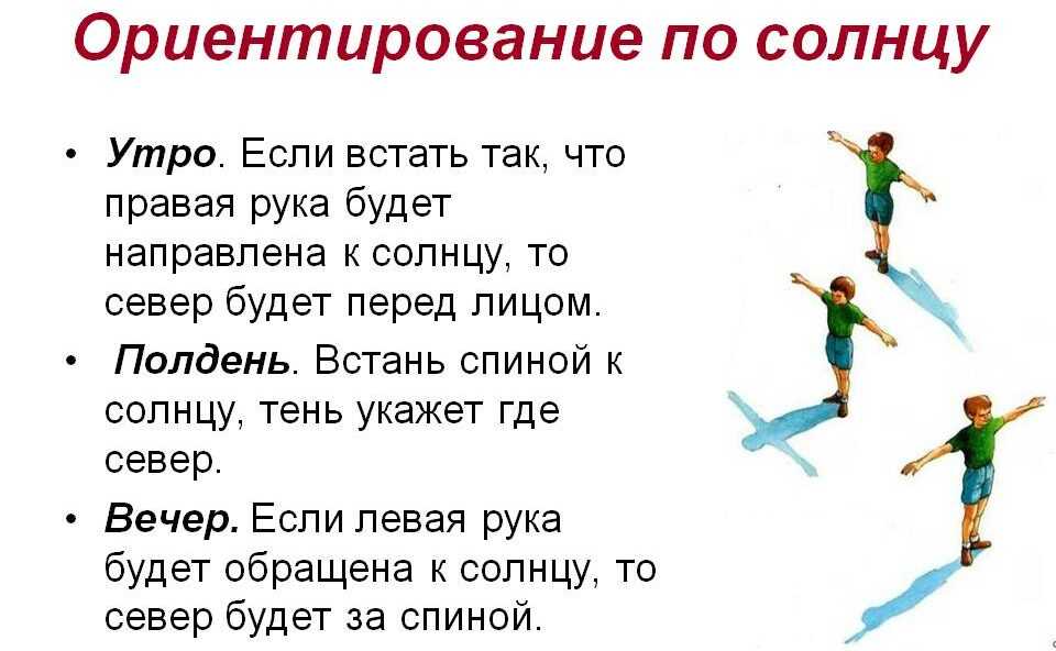 - Следует запомнить, что в северном полушарии в 7 утра Солнце находится на востоке, в час дня — на юге и в 7 часов вечера — на западе;