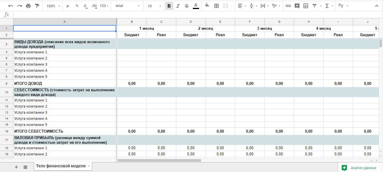 Мы не будем расписывать каждый пункт, который необходимо отразить в наших таблицах. Мы просто вставим тело этой самой таблицы в качестве примера. Вам останется дописать Ваши индивидуальные пункты, а также заполнить все цифровые показатели.